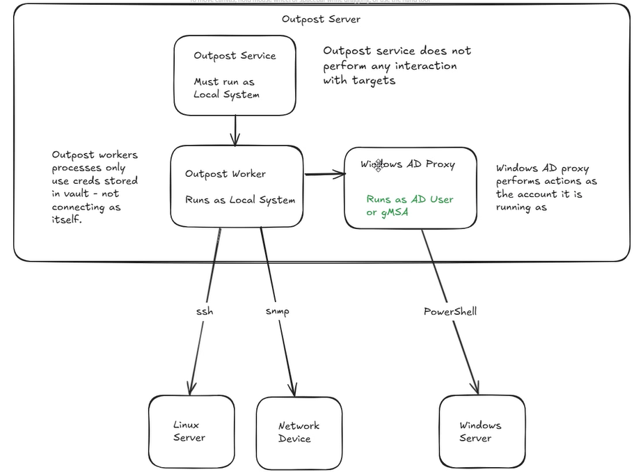 What are the most pertinent differences between Outposts and proxies ? Proxies can only scan windows IP. Outposts can scan everything. Proxies can't have their own credentials. Outposts can. Proxies are not password protected. Outposts are. Proxies can't have their own credential broker settings. Outposts can. Proxy upgrades are manual. Outposts upgrades are automated. Proxies can't manage scopes. Outposts can. It could be easier to open the Outpost default port (443) compared to the proxy ports (4321, 4323)